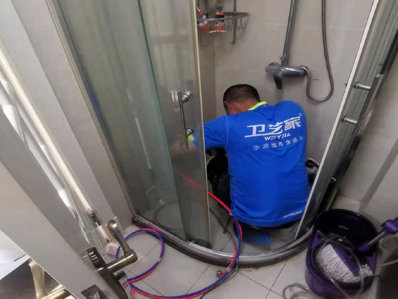 随后,师傅们借助绳索攀爬至王先生家外墙的漏水位置。在高空中,他们凭借丰富的经验和敏锐的洞察力,对墙体的渗漏情况进行了细致入微的勘察,精准地找到了渗漏源头以及受影响的范围。